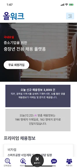 아래는 올워크 - 중장년 구인/구직 AI 맞춤 서비스 어플에 대한 스크린샷 정보입니다.