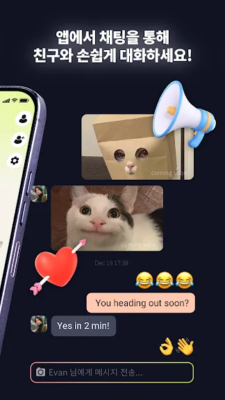 또한, 비공개 메시지 대화 기능을 통해 친구와의 소통이 더욱 재미있고 효율적입니다. 이모지를 사용한 즐거운 대화는 물론, 함께 계획을 세우거나 숙제에 대해 이야기하는 등 다양한 용도로 활용할 수 있습니다. 주변의 맛집이나 카페를 찾을 때도 유용하며, 친구 추가는 ID, 이메일, 전화번호 또는 QR 코드로 간편하게 할 수 있습니다.