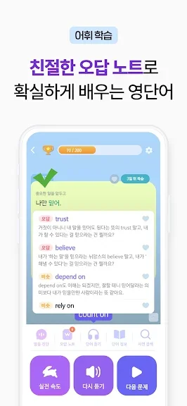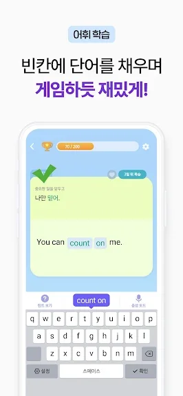 또한, 게임처럼 재미있게 학습할 수 있어 몰입도가 높습니다. 퀴즈를 풀면서 자연스럽게 영어 단어와 문법을 습득하고, 도전 과제를 완료하는 뿌듯함도 경험할 수 있습니다. 오답 노트 기능을 통해 틀린 문제에 대한 상세한 설명도 제공되며, '망각 곡선 이론'에 따라 자동 복습 시스템이 탑재되어 있습니다. 이로 인해 배운 내용을 오랫동안 기억할 수 있습니다.
