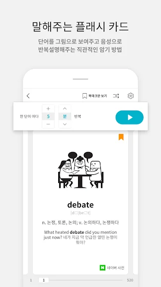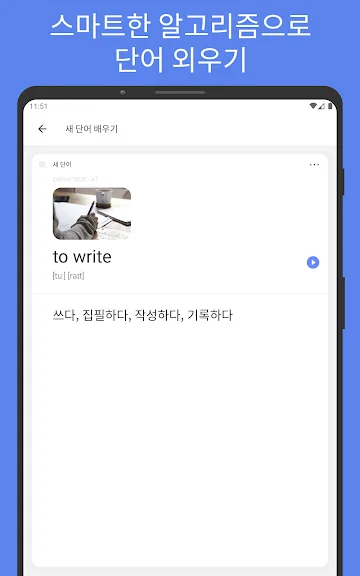 플래시 카드를 넘기기만 하면 되며, 원어민이 녹음한 고품질 발음으로 발음 학습도 가능하고, 자신만의 플래시카드를 만들어서 더욱 집중적으로 공부할 수 있습니다. 또한 스마트한 알고리즘이 학습을 돕고, 예문과 사진, 발음기호 등을 자동으로 채워줘 학습 효율성을 높입니다.