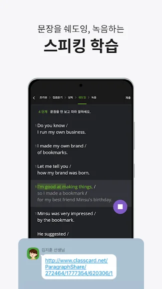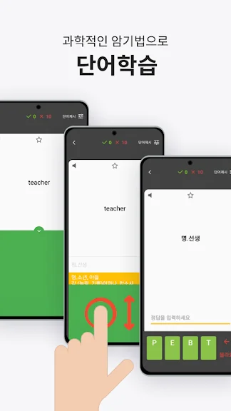 학생들에게는 과학적인 3단계 암기학습 방법을 통해 단어와 문장을 자연스럽게 암기할 수 있는 학습 환경을 제공합니다. 또한, 선생님이 제공하는 세트를 기반으로 한 목표 점수 도전 테스트와 오프라인 학습 모드까지 지원하여 언제 어디서나 효율적으로 공부할 수 있습니다.
