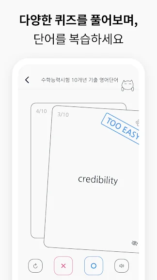 이 어플은 영어 실력을 빠르게 향상시키고 싶은 사람들에게 최적화된 학습 도구입니다. 사용자 맞춤형 학습 시스템을 통해, 20문제만 풀면 개인의 영어 수준에 맞는 퀴즈가 제공됩니다. 이를 통해 비효율적인 학습을 줄이고, 필요한 부분만 집중적으로 학습할 수 있습니다.