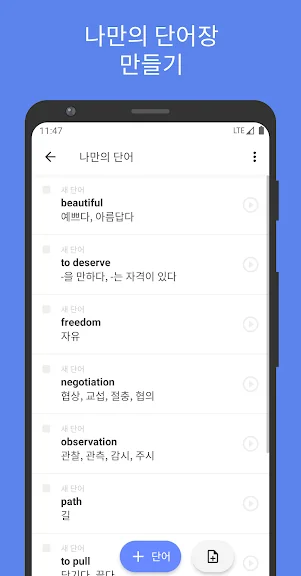 이 어플은 단어를 쉽고 편리하게 관리할 수 있는 기능을 제공합니다. 사용자는 단어를 입력하기만 하면, 자동으로 의미, 품사, 동의어 등을 구글 번역기를 통해 완성할 수 있어요. 또한, Excel이나 구글 시트에서 만든 단어장을 CSV 형태로 추가할 수 있어 매우 효율적입니다.