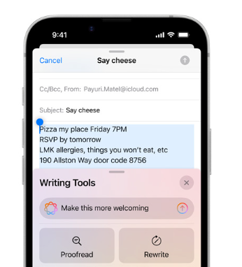 Apple Intelligence는 글쓰기 보조 기능을 포함하여 AI 기반의 다양한 편의 기능을 제공합니다. 이를 통해 문서를 보다 쉽게 작성하고, 이메일을 정리하며, 이미지 편집도 간편하게 수행할 수 있습니다.