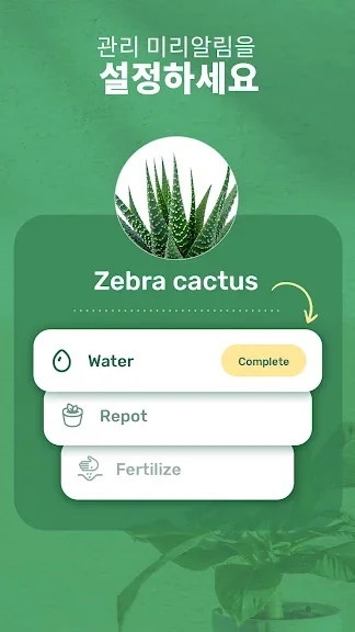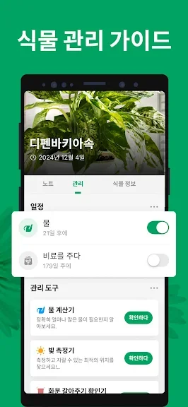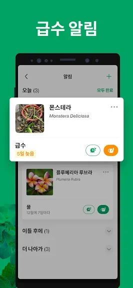 물, 비료, 분무, 청소와 분갈이 시간이 되었을 때 알림을 받으세요. 식물에 특별한 관리가 필요한 경우에는 맞춤 미리 알림을 설정하세요.