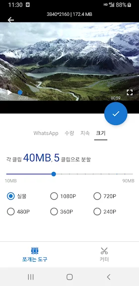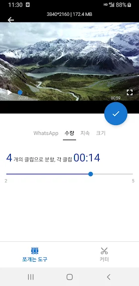 * WhatsApp 상태 및 Instagram 스토리에 대한 비디오를 필요한 길이로 쉽게 분할합니다. 수량 또는 지속 시간별로 클립을 사용자 정의할 수 있습니다.