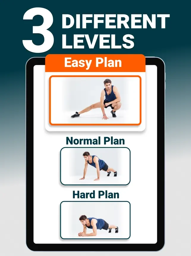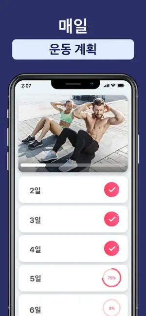 - 전문가가 설계한 3가지 난이도(쉬움, 중간, 어려움)에 기반한 복근 운동.