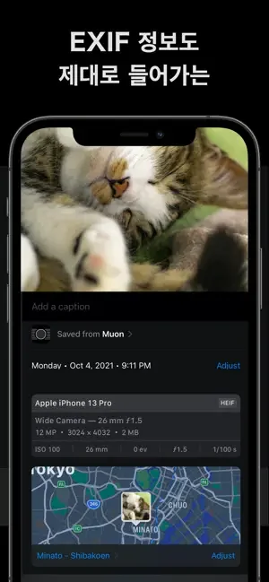 • 사진의 EXIF 정보에 위치 정보, 노출 설정, 셔터 스피드 등 다양한 촬영 정보를 기록합니다.