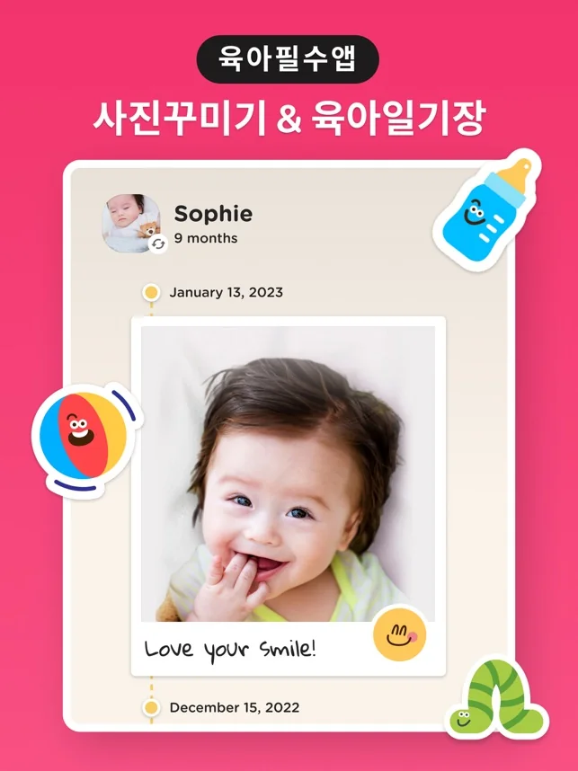 - 손으로 그린 일러스트 스티커들과 다양하고 멋진 폰트를 이용해 아이의 사진을 더 예쁘게 꾸미게 도와줍니다.