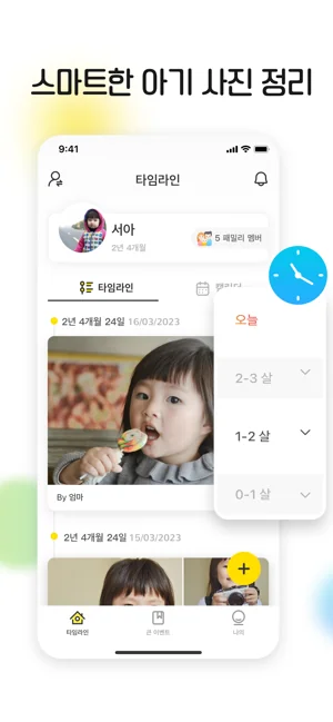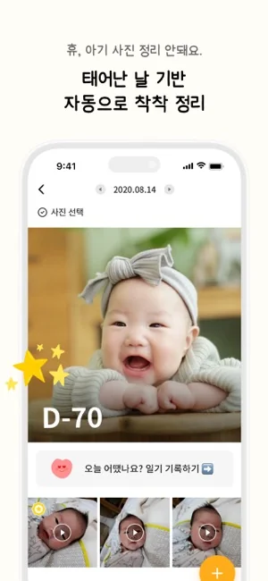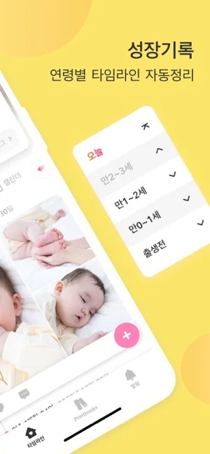 업로드한 모든 사진과 동영상은 아기의 연령별로 자동 정리되므로 아기의 모든 성장 순간들을 놓치지 않고 간직할 수 있습니다.