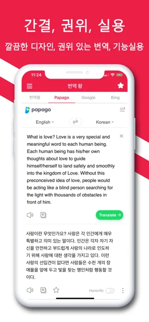 특징: Papago, Google, Bing 플랫폼 통합! 단순하고 강력한, 오직 번역만을 위한, 복잡하고 쓸모없는 기능들을 제거하라! 번역 전문가!