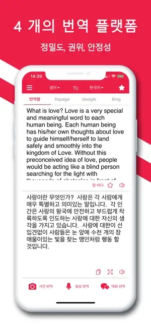 카메라로 사진의 텍스트를 자동으로 인식하고 번역하거나 사진을 스캔하고 버튼을 누르면 단어를 탭하여 의미를 알거나 번역된 모든 단어를 볼 수 있습니다.