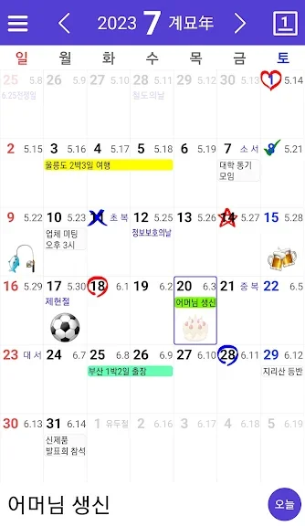 - 달력에 O,X,♡,☆, 이모티콘, 손글씨 표시 → 날짜 롱클릭