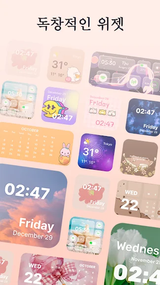 독특한 위젯: 위젯 컬렉션으로 홈 화면에 기능과 스타일을 추가하세요. 날씨 예보에서 달력 위젯까지 Themes: 앱 아이콘, 위젯, 테마, 배경화면는 다양한 옵션을 제공하여 정보를 제공하고 화면을 정리할 수 있습니다.