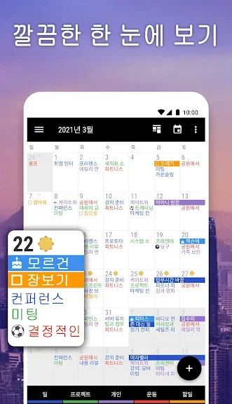 회의, 마감일 및 약속을 체크할 때 유용한 일정 관리 캘린더입니다. 달력는 당신의 하루 일정을 시각화하고 공휴일, 휴가, 그리고 일정과 같은 중요한 이벤트가 있을 때 알람으로 상기시켜줍니다.