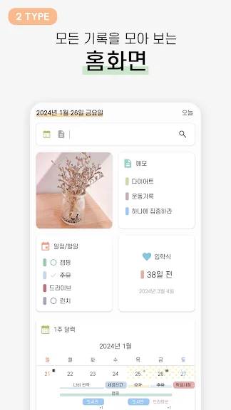 단 한 번의 탭으로 일일 플래너에 액세스하고, 이벤트를 설정하며, 하루의 작업을 관리할 수 있습니다. 메모를 작성하고, 알림이나 알람을 설정하여 비즈니스나 개인적인 중요한 일정을 절대 놓치지 마세요.