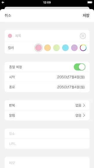 - 굿 달력 앱의 인터페이스는 간단하고 효율적입니다. 두 단계만으로 여러 약속 및 이벤트를 만들 수 있습니다.