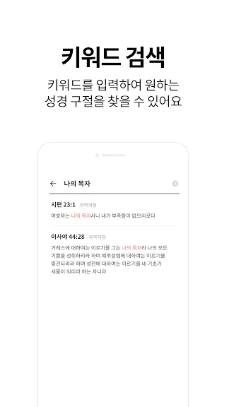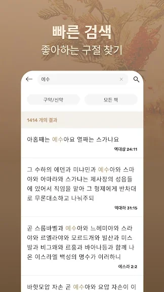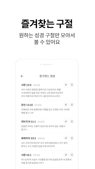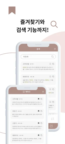 검색 기능과 즐겨 찾기 - 말씀 구절을 검색하여 찾을 수 있으며 나만의 즐겨 찾기로 쉽고 편리 하게 사용하실 수 있습니다.