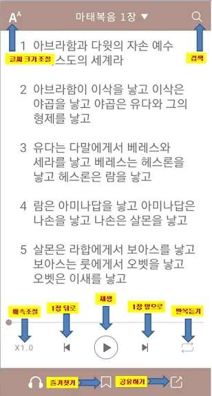 큰 글씨 조절하기- 시력이 안 좋으신 분들은 글씨 크기를 조절하여 편하게 오디오와 글씨를 보고 외우며 통독 할 수 있습니다.