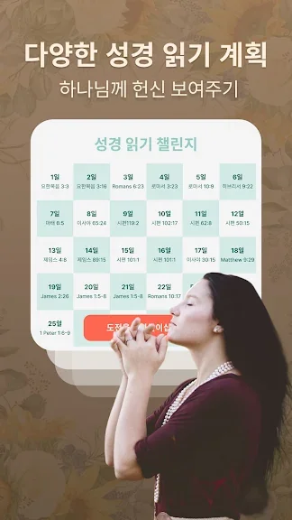 이 앱에서 적합한 성경 읽기 계획을 선택하여 전체 성경을 읽을 수 있습니다.