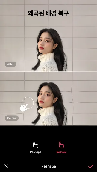 ・ 터치 보정, 3D 얼굴 보정, 좌우 각각 보정, 프리셋, 왜곡 펴기: 자연스럽고 디테일한 얼굴 보정