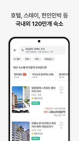 [고급 검색 필터] 트립닷컴에서 전세계 140만 개 이상의 호텔을 검색할 수 있습니다. 저렴한 아파트, 고급스러운 5성급 호텔, 아늑한 홈스테이, 다양한 레크리에이션 시설을 갖춘 리조트 등 원하는 숙소를 쉽게 찾을 수 있습니다.