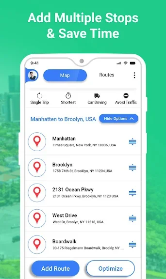 GPS 라우터 추적 앱에는 가장 빠른 배송 경로 플래너 기능이있어 가장 짧은 배송 경로를 제공합니다. 배송을 위해 목적지 주소와 필요한 여러 정거장 목록을 추가하면이 GPS 내비게이션 앱은 교통 체증을 피하는 경로를 탐색하고 최상의 배송 경로를 제공합니다. 멀티 스톱 노선 플래너는 또한 여행에 대한 예상 시간 도착을 제공합니다. 이것은 택배 회사의 직원과 모든 사람을위한 최고의 도로 여행 플래너 및 GPS 경로 플래너입니다.