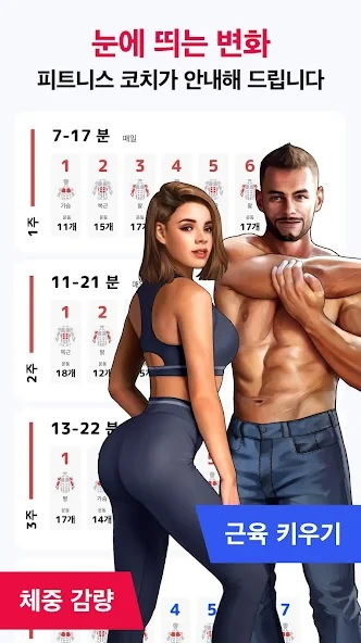 신체 단련, 칼로리 소모, 체중 감량, 건강 유지에 도움이 되는 다양한 피트니스 운동 계획이 제공됩니다. 귀하의 개인 트레이너가 부지불식간에 더 매력적인 몸매를 가꾸도록 도와드릴 것입니다!