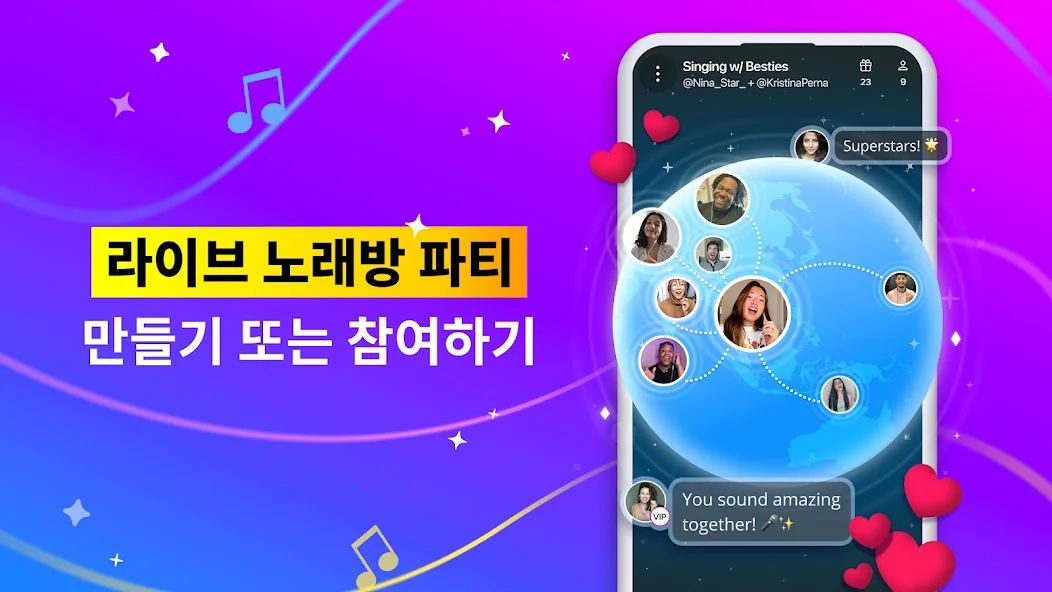 - 실시간 글로벌 공연: 라이브 공연을 열어 팬들의 실시간 피드백을 받고 팬을 얻어보세요! 전 세계의 가수들과 연결되어 자신만의 무대를 만들어보세요. Smule의 Sing Live 기능을 통해 24시간 동안 노래를 즐길 수 있습니다.