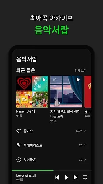 [음악서랍] 최애곡들만 모아 내 음악서랍에 담고, 좋아하는 음악들로 플레이리스트를 만들고 관리할 수 있습니다.