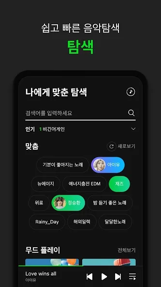 [탐색] 나에게 맞는 추천 태그 기반으로 손쉽게 검색할 수 있고, 장르와 무드별 추천 음악을 감상할 수 있습니다.