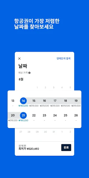 달력 화면에서 날짜별 항공권 최저 요금을 비교해 가장 저렴한 날을 선택하세요. 가격 알림(Price Alert)을 켜 두면 요금 변동 시 즉시 알려 드려 특가를 놓치지 않습니다.