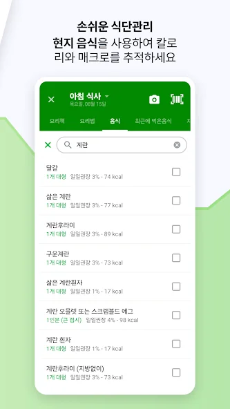 이 앱은 방대한 음식 데이터베이스와 간편한 검색 기능 덕분에, 식사 때마다 빠르게 먹은 음식을 기록하는 일이 어렵지 않아요. 바코드 스캔 기능도 있어서, 슈퍼마켓에서 산 간편식도 쉽게 등록할 수 있답니다.