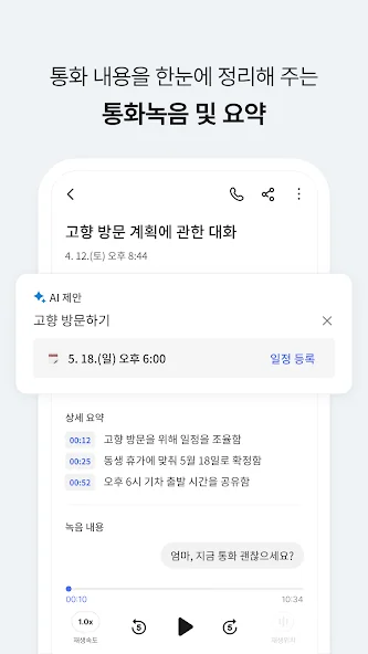 게다가 깔끔한 요약 기능까지 함께 제공돼서, 긴 통화 내용도 핵심만 정리된 형태로 바로 확인할 수 있어요. 이동 중이나 운전하면서도 손쉽게 중요한 내용을 파악할 수 있어 정말 편리하죠.